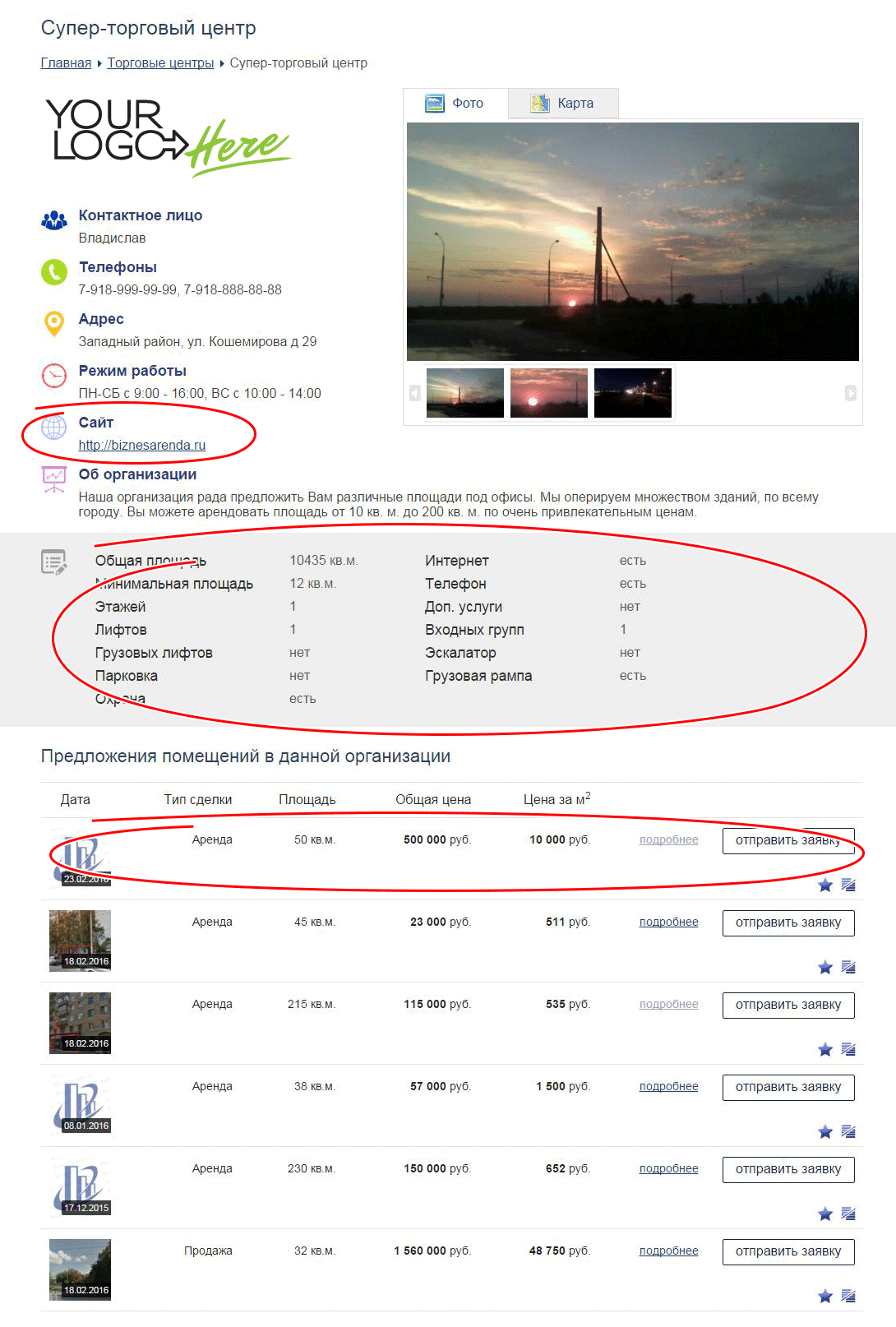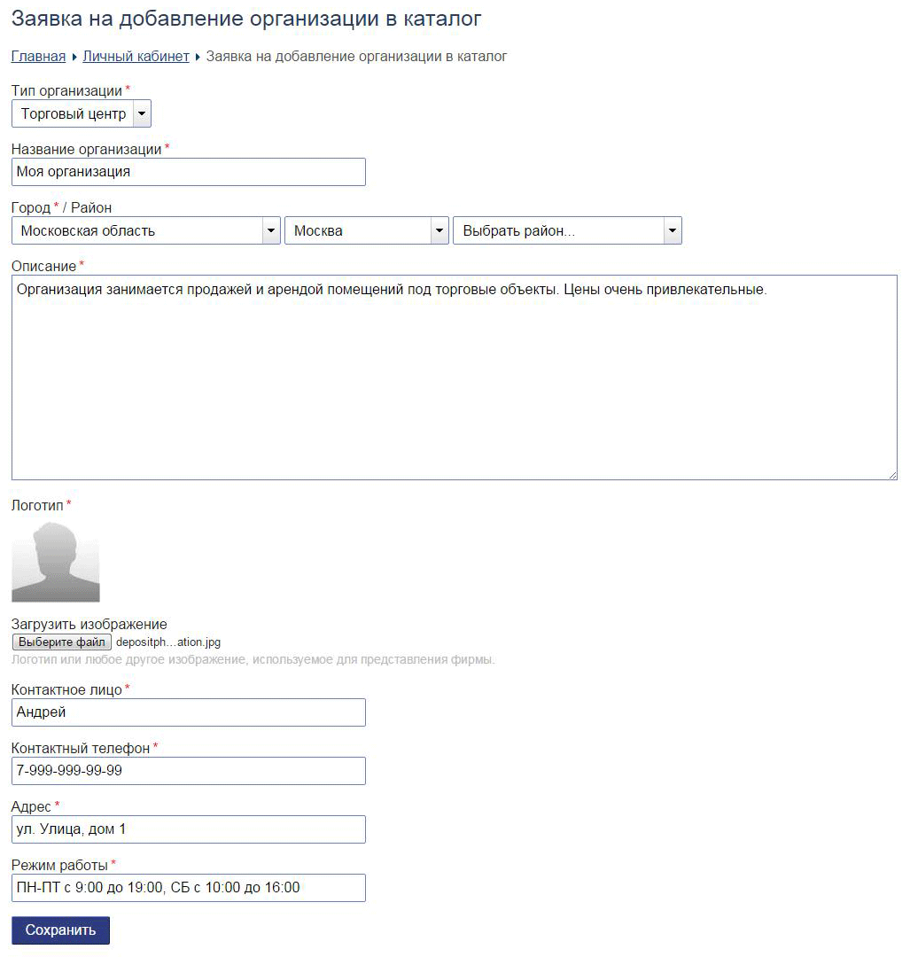 После одобрения заявки, в редакторе организации появятся дополнительные поля, соответствующие типу организации и позволяющие максимально подробно описать характеристики имеющихся объектов аренды/продажи.