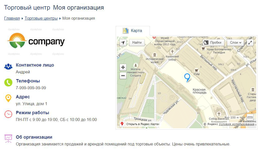 Размещение организации в каталоге Бизнес-Аренда бесплатно, с некоторыми ограничениями. Например, если у Вас есть сайт, то на бесплатной странице организации он отражен не будет. Не будут показаны также дополнительные поля организации, такие как данные о имеющихся площадях, этажности, наличии лифтов, охраны и тому подобное. Отображение списка объявлений организации также доступно только на оплаченной странице.