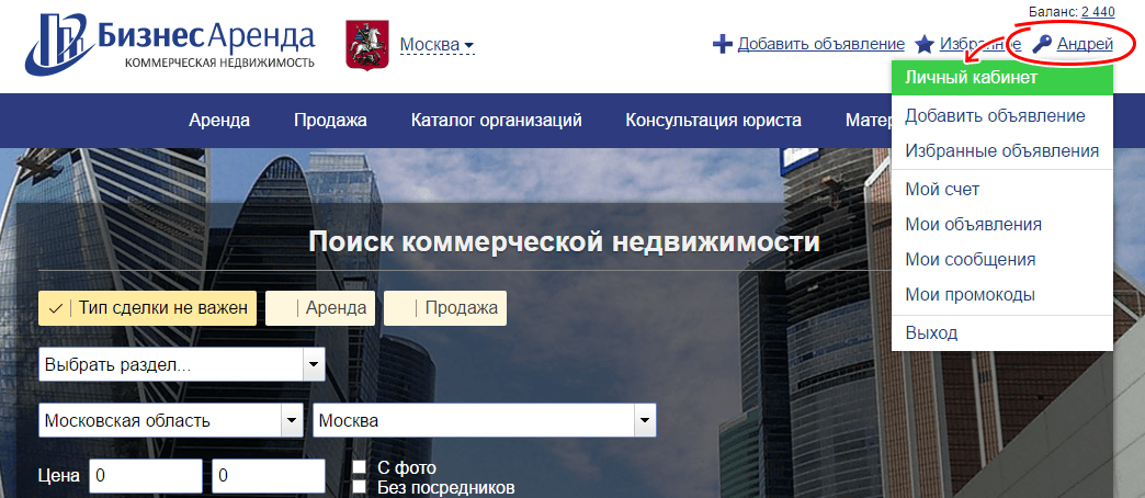 Зарегистрируйтесь на сайте, если у Вас еще нет личного кабинета. Зайдите в личный кабинет с помощью меню, как показано на иллюстрации ниже.